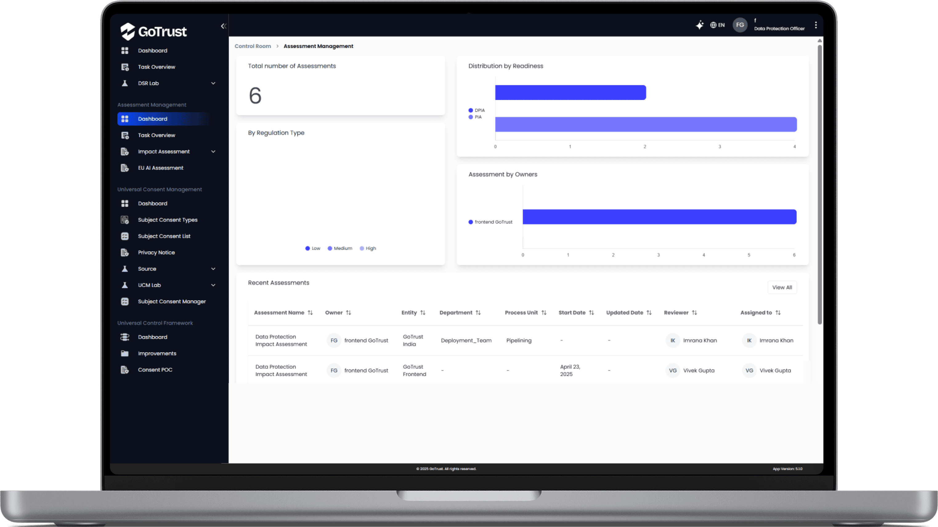 GoTrust helps in monitoring your organization’s assessment landscape through an intuitive dashboard that displays total assessments, regulation-based distribution, and readiness levels (Privacy Impact Assessment, Legitimate Impact Assessment, Transfer Impact Assessment). This comprehensive overview ensures you maintain clear visibility of your privacy assessment portfolio and compliance status.
