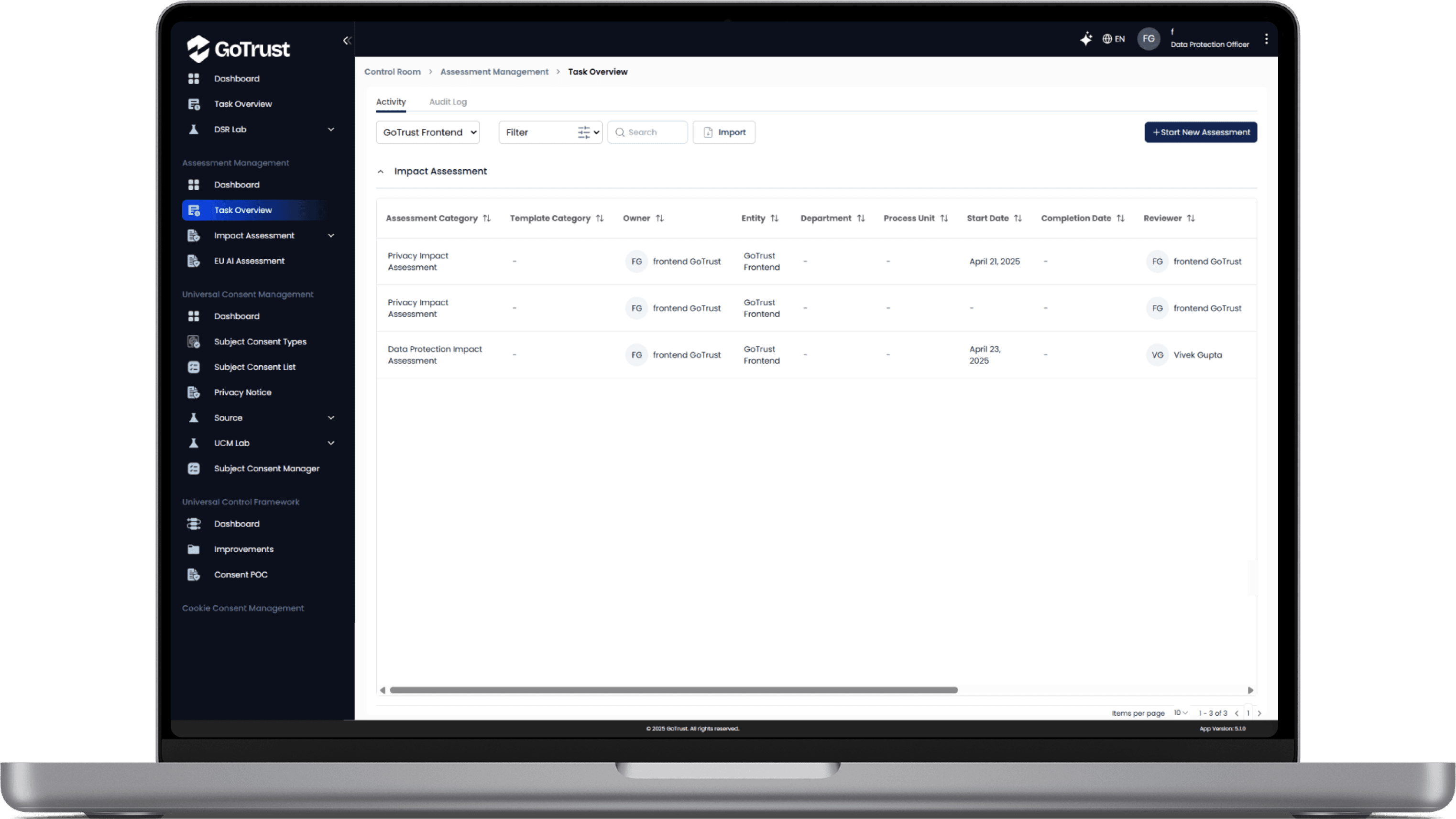 GoTrust seamlessly maintains clear accountability with the robust ownership tracking system. Each assessment is assigned to specific owners, ensuring clear responsibility and streamlined workflow management. The system provides complete visibility of assessment distribution across your Assessment Ownership organization's privacy champions.